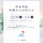 2025年12月17日 / 最終更新日時 : 2025年12月17日 nr75889 お知らせ 年末年始のお知らせ 年末年始のお知らせ こんにちは。 名古屋市中川区のあーる鍼灸院です。 年末年始の診療スケジュールについてお知らせいたします。 ■ 年末年始の休診日について 誠に勝手ながら、下記期間は休診とさせていただきます。 休診期間 […]